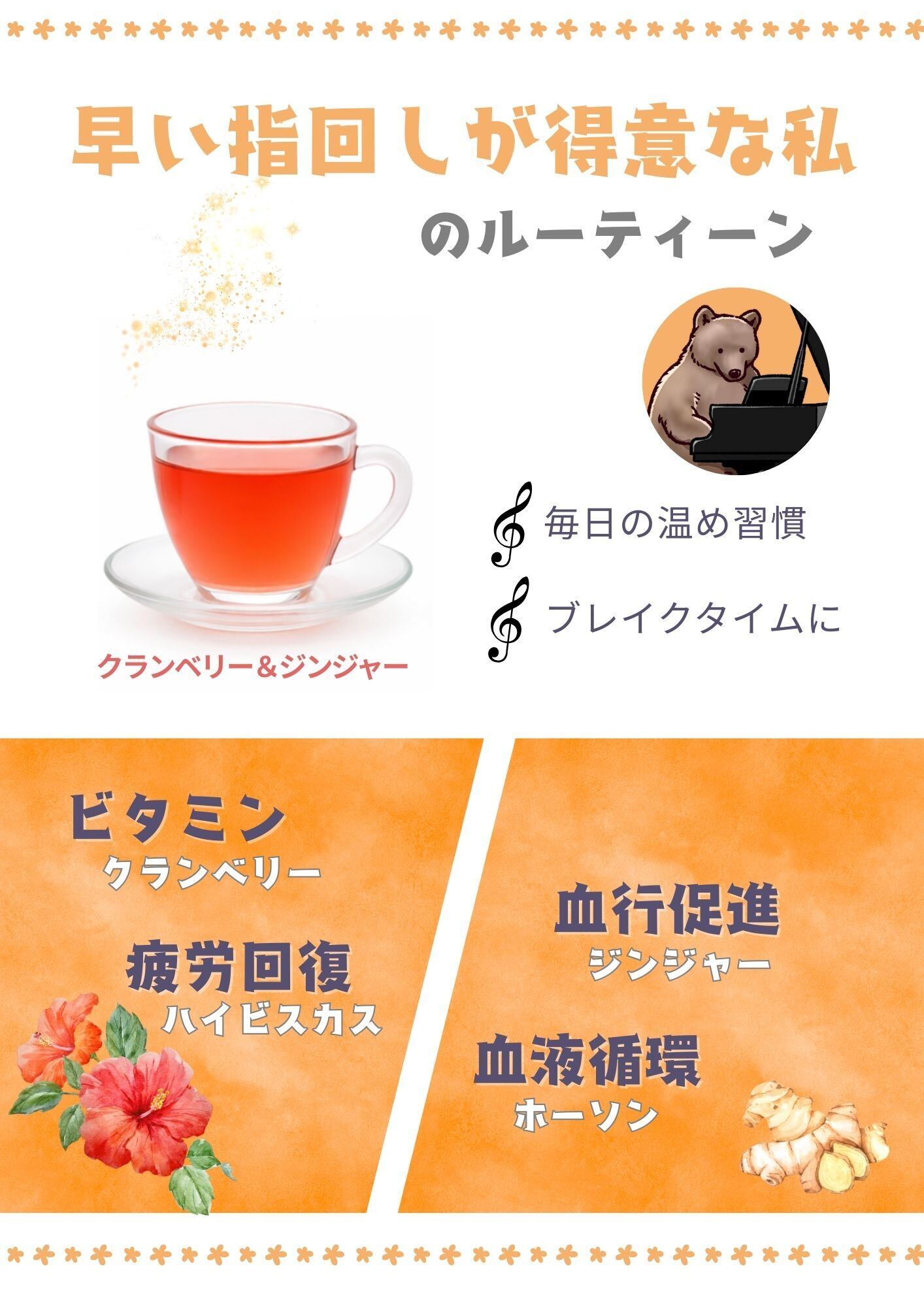 ハイビスカス(スペイン)、ジンジャー、クランベリー、ステビアリーフ、ジャーマンカモミール、ローズヒップ、ラズベリーリーフ、ホーソン、レモングラス、スイートクローバー、ローズレッド、オレンジピール
